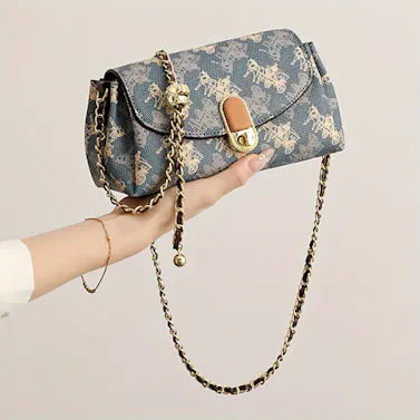 Elegant Chain Bag, Women's Lightweight Premium Commuter Shoulder Bag - Vintage Printed Handbag with Detachable Strap, Gold Hardware, Brown Texture Finish.
